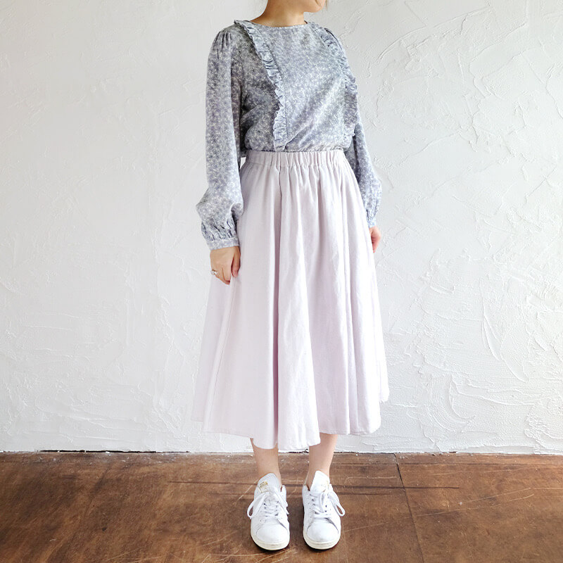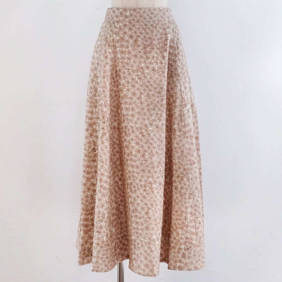 これはもうkapuwa定番の6枚はぎのスカート。私が学生時代に、人生で一番最初に作ったスカートがゴアードスカートとうプチ情報w各パーツが台形になっているパターンを縫い合わせるので、裾に向かってきれいにシルエットがでるスカートなんです。ウエストがすっきりしてるのがポイントで、細い方は是非トップスをINして綺麗なウエストを強調してくださいね♩